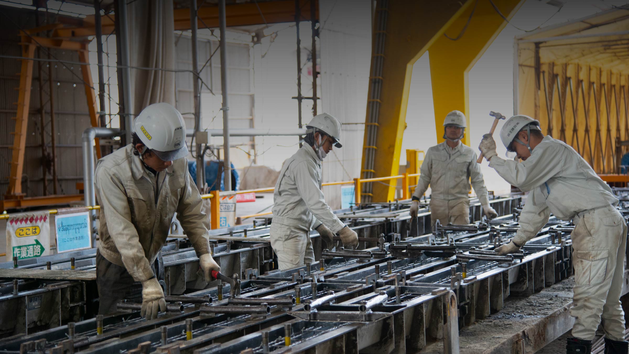 毎日の作業では、鉄筋を型枠にセットし、付属部品を取り付け、生コンクリートを流し込み製品を造っています。同じ作業の繰り返しのようですが、少しずつ形状や鉄筋の位置が違ったりするので緻密な作業が求められます。また、図面を読み解くスキルも必須です。また、生コンを流し込む作業は、気温などに左右されやすい特性があります。乾き具合の判断などでは、やはり職人の経験が求められ、微妙な調整を日々行っています。